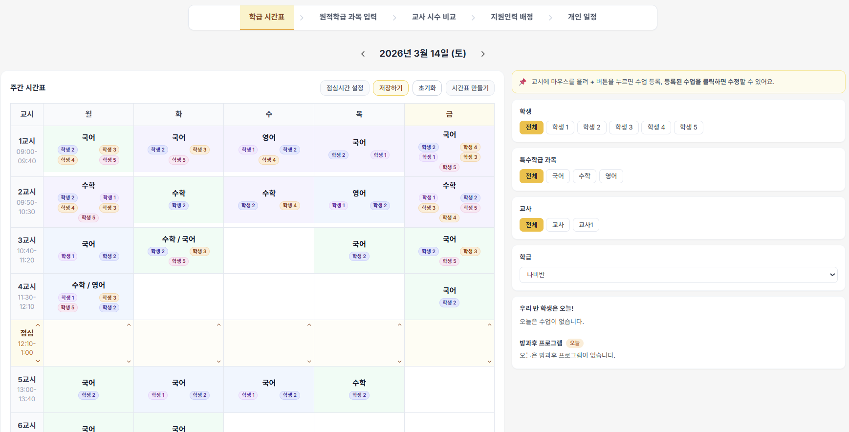 - ✓클릭만으로 교시별 원적학급 배치 완료